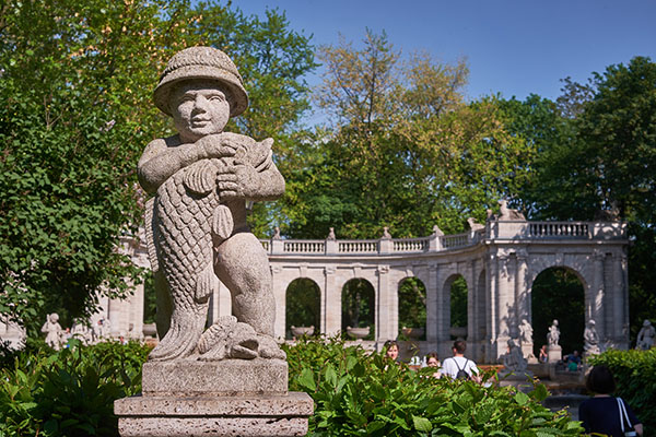 Man betrat den westlichen Haupteingang zur Parkanlage durch das Königstor, kam zu einem mit Blumenbeeten gesäumten Vorplatz, der sich zu einem schmalen Weg verengend, schließlich den Blick auf den Kaskadenbrunnen mit seinen vier geschweiften Becken freigab. Umschlossen werden sie noch heute von einer Kolonnade mit Pilastern und Tierfiguren. Hinter ihr lag der Delfinbrunnen mit weiteren Skulpturengruppen, von hier aus setzte sich der Weg mit einem ovalen Platz zum rückwärtigen Tor im Osten fort.
