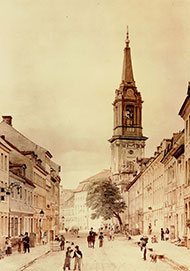 Im historischen Zentrum Berlins, dem seit dem Mittelalter urbanen Klosterviertel, wurde 1703 die Parochialkirche (‚Parochie’ heißt ‚Pfarrbezirk der Kirchengemeinde’) als Stadtkirche für die reformierte Gemeinde eingeweiht. Die Parochialkirche gilt als erster barocker Kirchenbau von Rang in Berlin, dessen Eingangsfassade „den gleichzeitigen Bauten des Hofes in keiner Weise nachstand und zum besten der Berliner Barockarchitektur um 1700 gehört“ (Prof. Badstübner-Gröger). Der Entwurf stammte von dem neben Schlüter bedeutendsten Berliner Baumeister der Zeit, Johann Arnold Nering, und wurde von dessen Schüler Martin Grünberg vollendet.