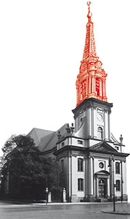 Der Verein Denk mal an Berlin e.V. hatte es sich zur Aufgabe gemacht, die Kirchturmspitze in ihrer historischen Gestalt als eines der bedeutendsten Beispiele der Berliner Barockkunst vollständig, einschließlich des Glocken- und Uhrengeschosses mit dem Glockenspiel und der Turmuhr, wiederaufzubauen.