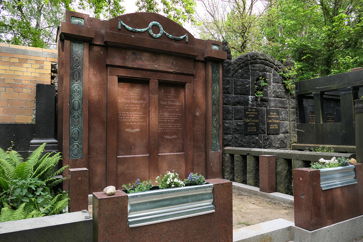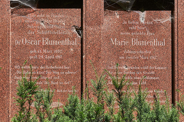 Der Verein konnte Förderzusagen und Spenden für die Sanierung des Blumenthal-Grabmals in voller Höhe einwerben. Durch Fördergelder der Deutschen Stiftung Denkmalschutz mit Hilfe der Lotterie GlücksSpirale und des Landesdenkmalamtes sowie Spendengeldern konnte das Grabmal Blumenthal restauriert werden. Im Mai 2021 hat der Steinrestaurator Lutz Dölle mit den Arbeiten an den Steinfundamenten begonnen. Die Reinigung und Restaurierung der Grabwand sowie die Verfugung entsprechend der Befundlage sind von Juni bis Oktober erfolgt. Mit der Reinigung, Restaurierung und Neuformung der Metallapplikationen hat der Metallrestaurator Thomas Dempwolf in seiner Werkstatt im September begonnen. Auch die neuen Pflanzgefäße sind gemäß historischer Fotos angefertigt. Im Frühjahr erfolgte die Anbringung der Metallornamente und Pflanzgefäße. Die Bepflanzung der Blumenkästen und des Grabfeldes hat der Verein übernommen, die Pflege des Grabmals wird vom Friedhof getragen. Die offizielle Abnahme durchdie Denkmalbehörden fand am 10. Mai 2022 statt. Danach führte uns Klaus-Dieter Ehmke zur Feier des Tages zum Thema Persönlichkeiten der Literatur und des Theaters in Berlin über den Jüdischen Friedhof Weißensee.