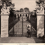 Man betrat den westlichen Haupteingang zur Parkanlage durch das Königstor, kam zu einem mit Blumenbeeten gesäumten Vorplatz, der sich zu einem schmalen Weg verengend, schließlich den Blick auf den Kaskadenbrunnen mit seinen vier geschweiften Becken freigab. Umschlossen werden sie noch heute von einer Kolonnade mit Pilastern und Tierfiguren. Hinter ihr lag der Delfinbrunnen mit weiteren Skulpturengruppen, von hier aus setzte sich der Weg mit einem ovalen Platz zum rückwärtigen Tor im Osten fort.